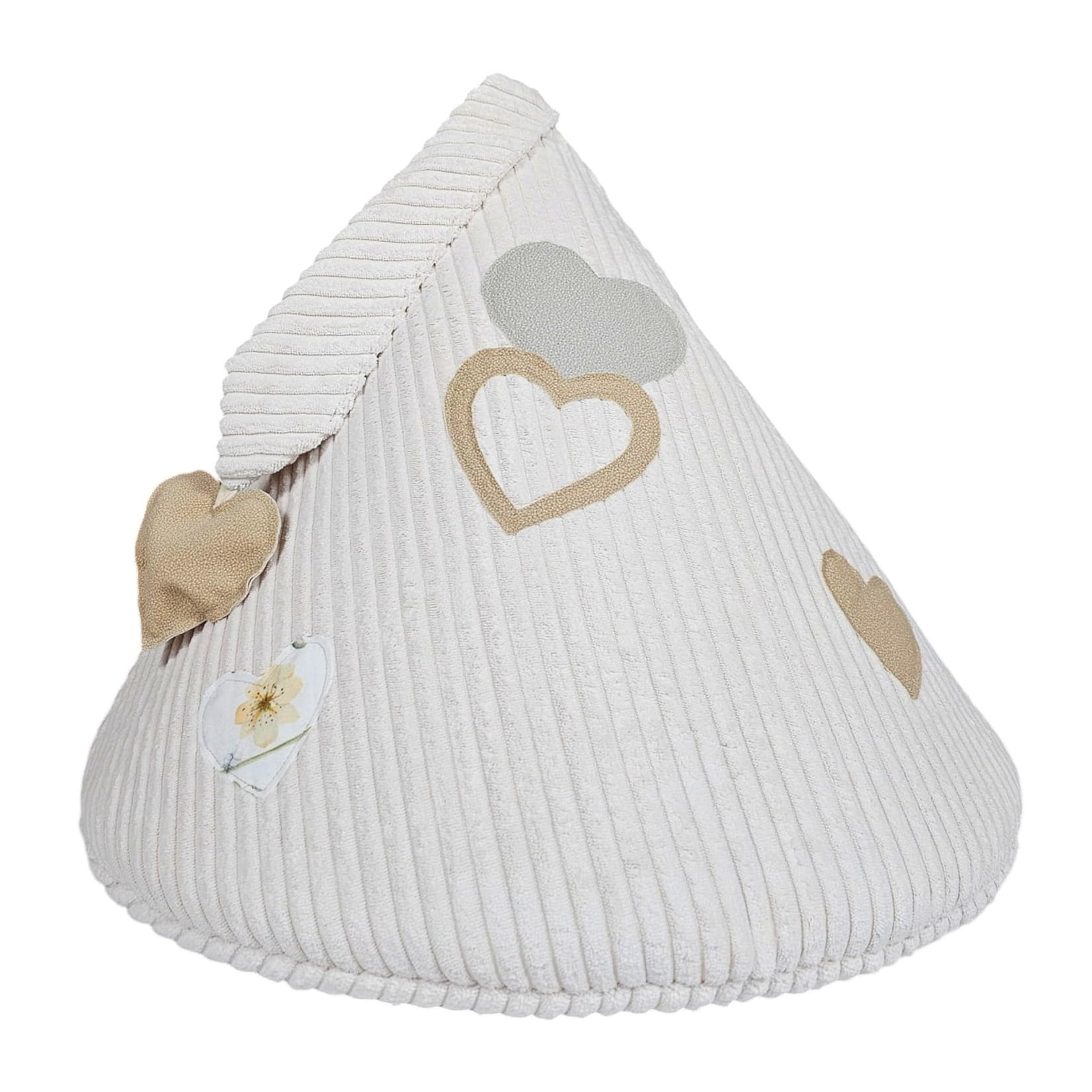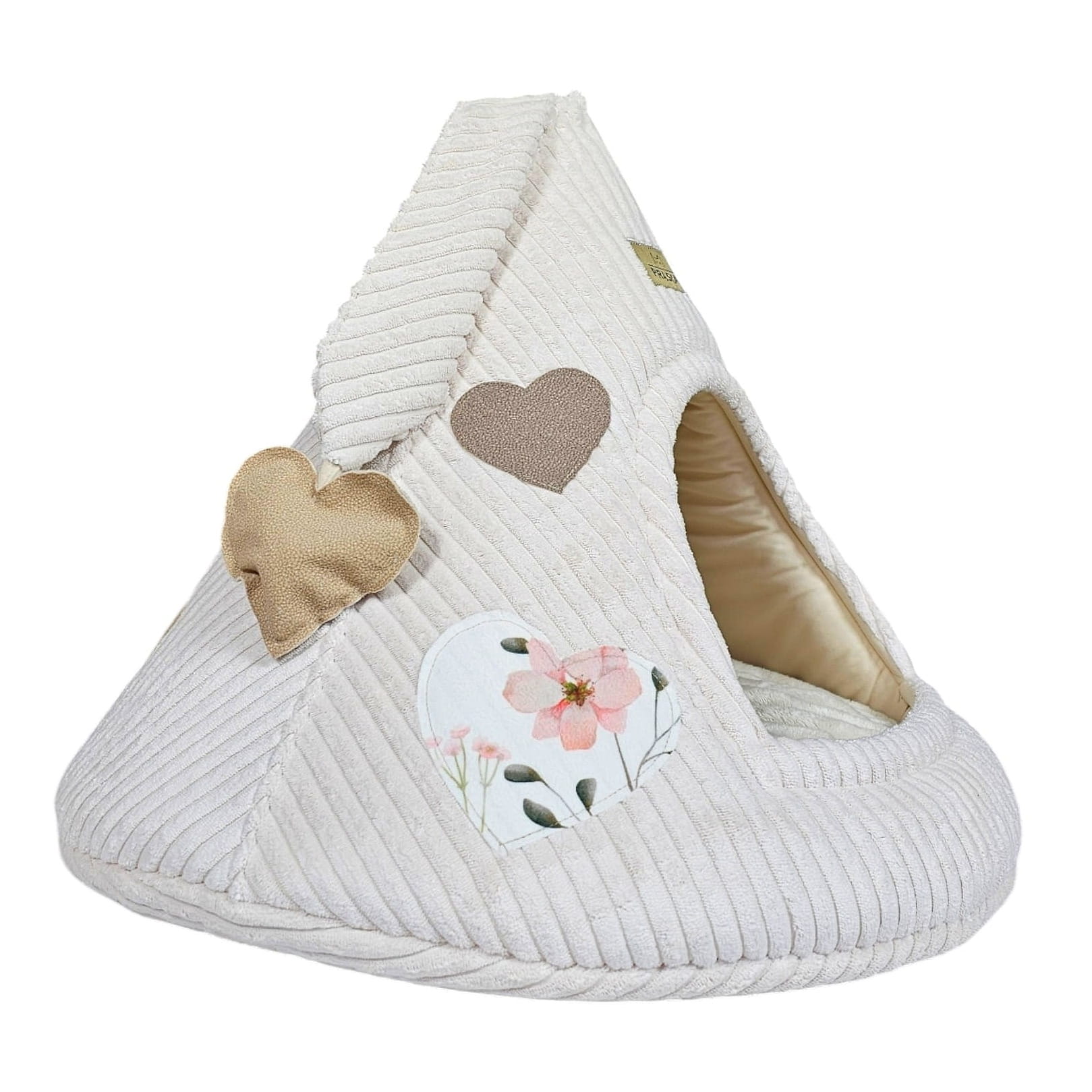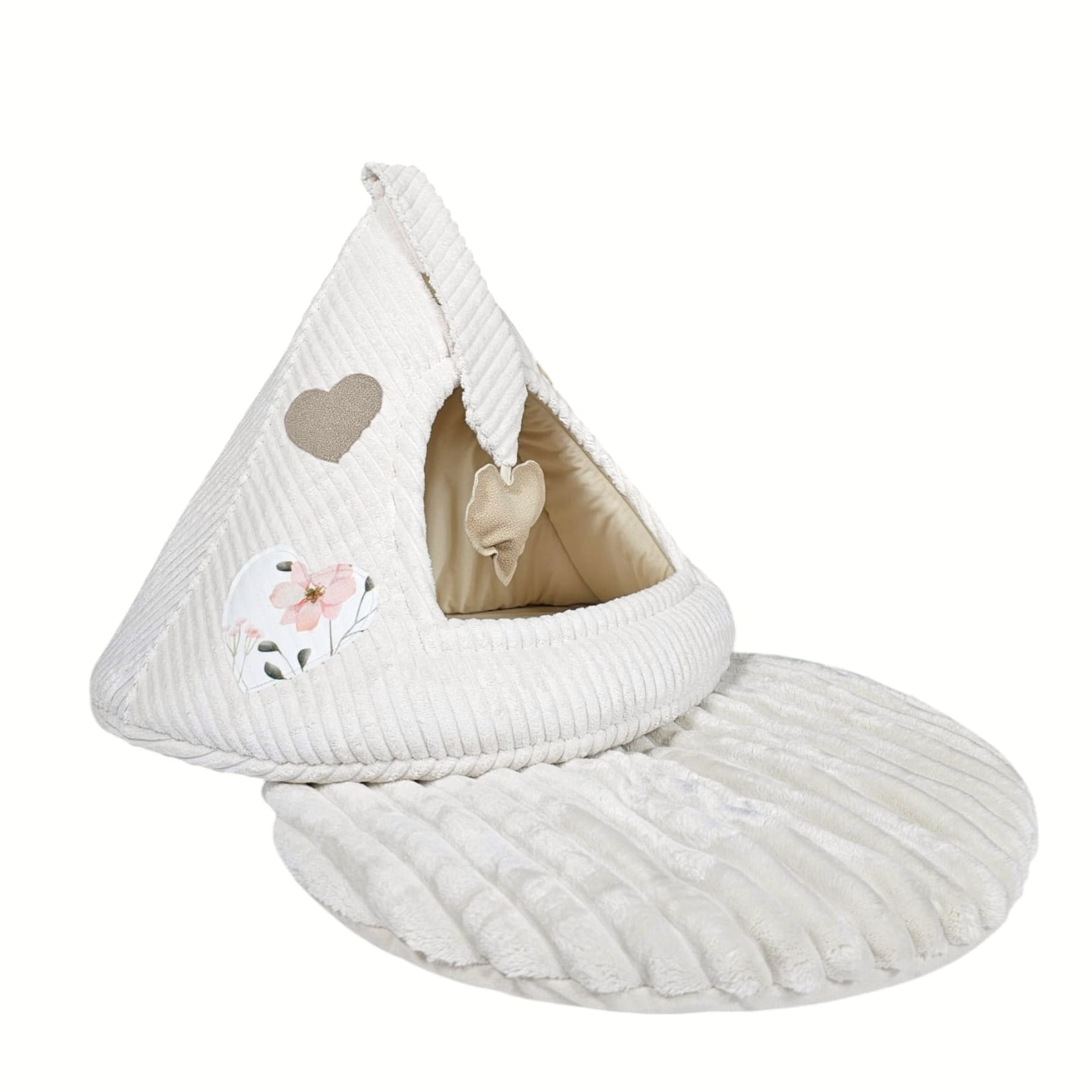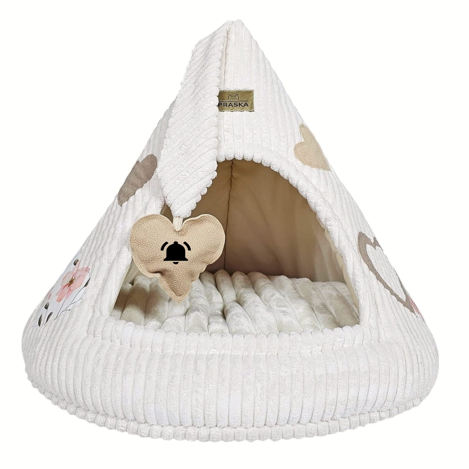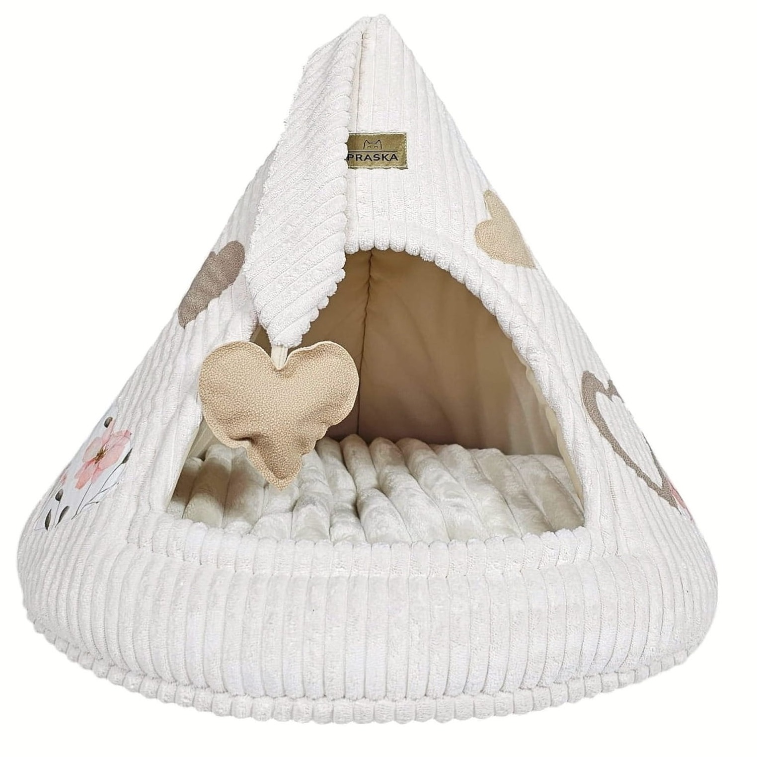 Mleczna budka z miękkim futrem i aplikacjami w kształcie serduszek w naturalnych odcieniach beżu. Jasna, neutralna kolorystyka sprawia, że budka dobrze odnajduje się w przestrzeni domowej i nie dominuje wnętrza. Starannie wykonana, niezgniatająca się budka, w której kot może spokojnie zasnąć, wyciszyć się i schować przed nadmiarem bodźców lub pobawić się zawieszoną, sensoryczną zabawką. Zamknięty kształt naturalnie daje poczucie prywatności, którego koty instynktownie szukają.