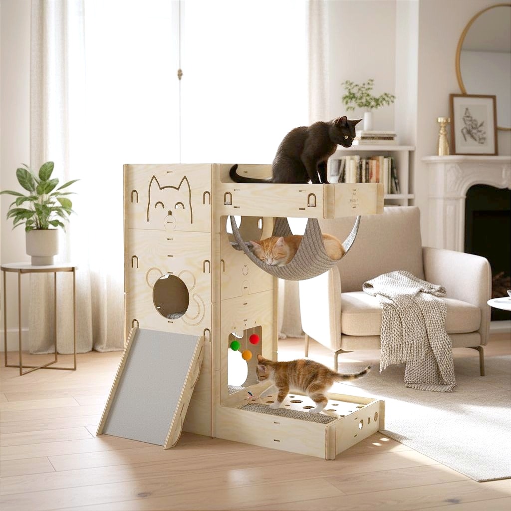 - Modułowy design – Kilka poziomów tworzących labirynt co pobudza naturalne instynkty kota.