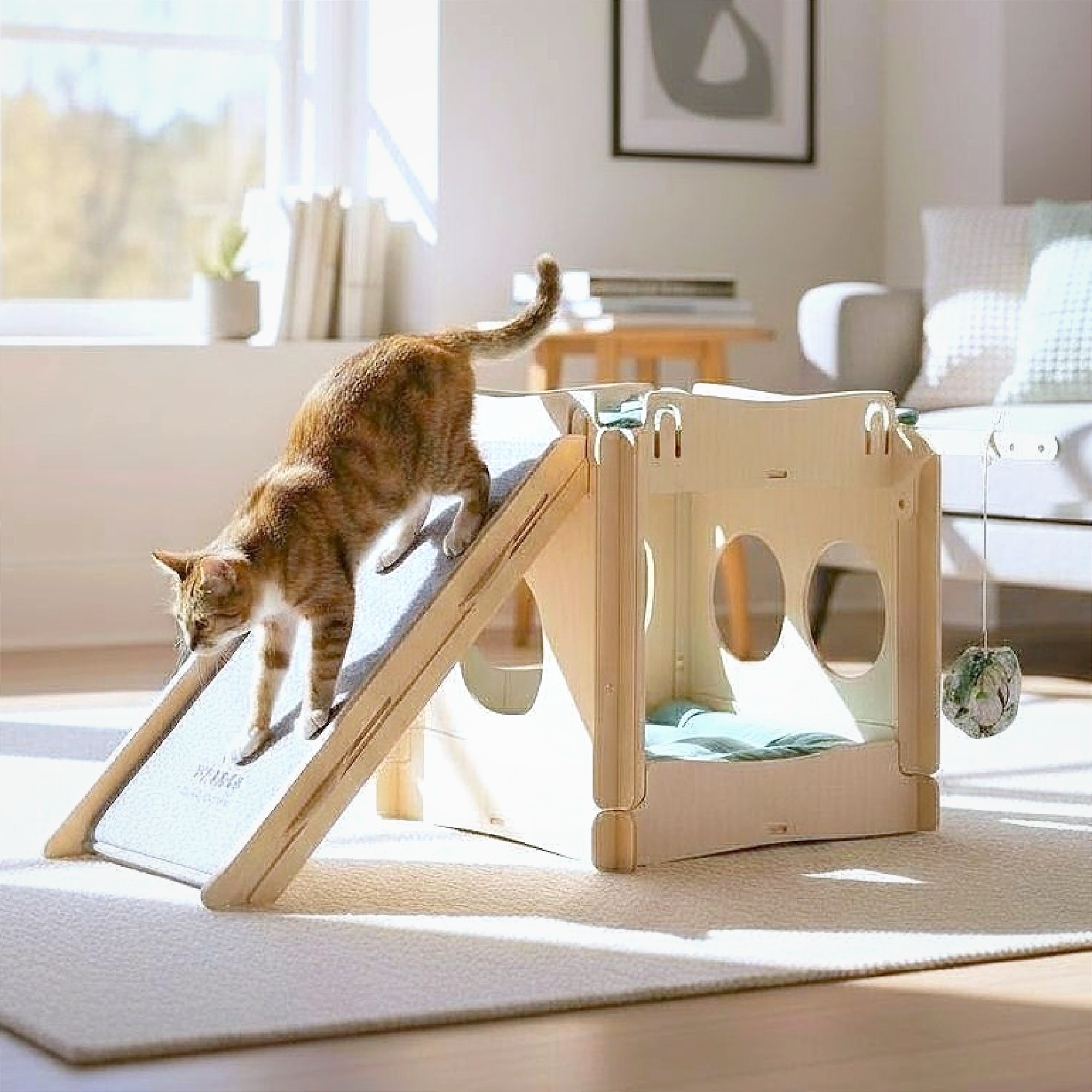 Luksusowy, modułowy mebel dla kota, który łączy w jednej konstrukcji kryjówkę, drapak, przestrzeń do zabawy oraz miejsce do odpoczynku.