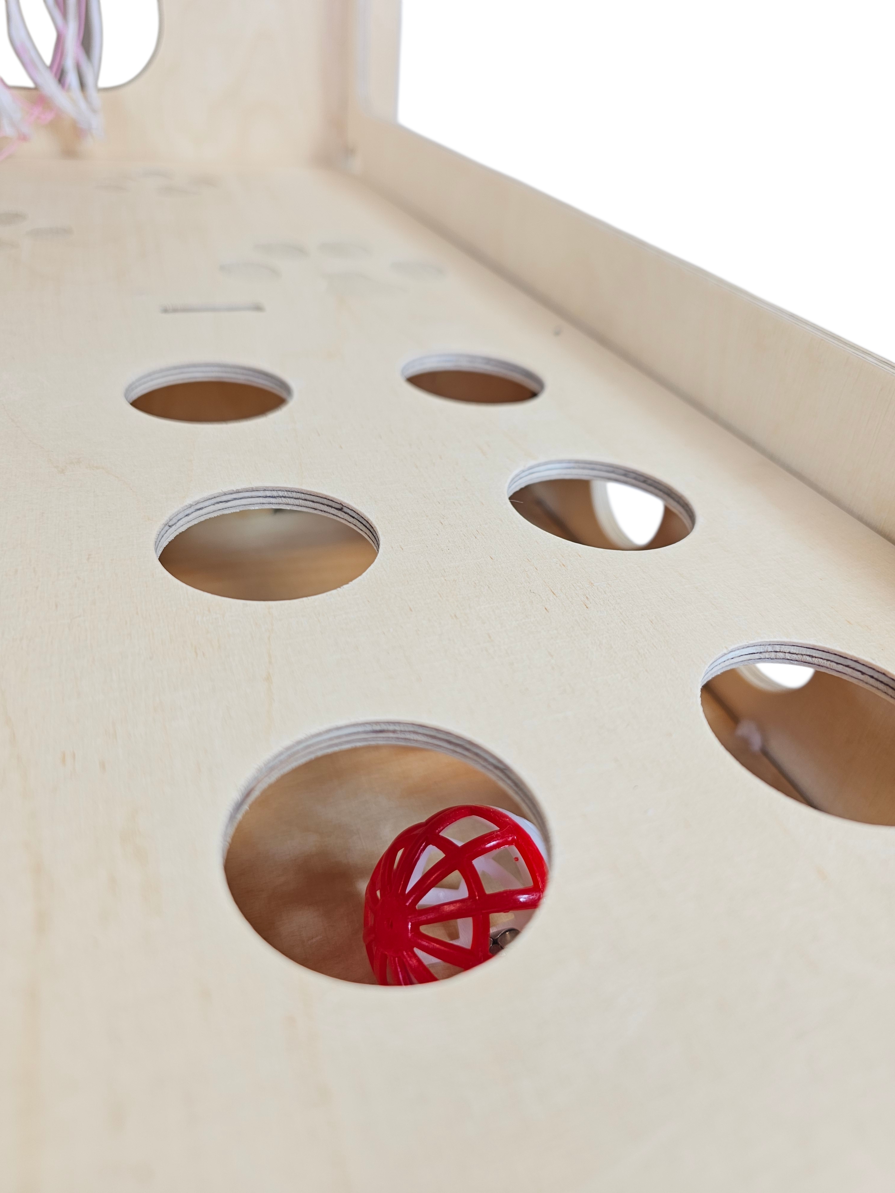 Otwierany moduł ZABAWKA – specjalne wycięcia z piłeczkami. Moduł może służyć również do przechowywania zabawek.
