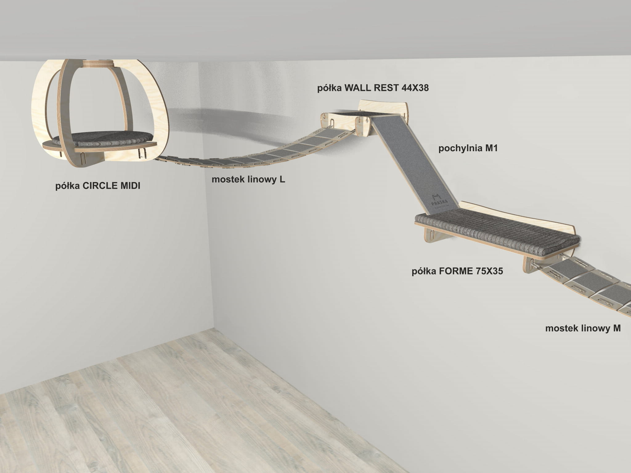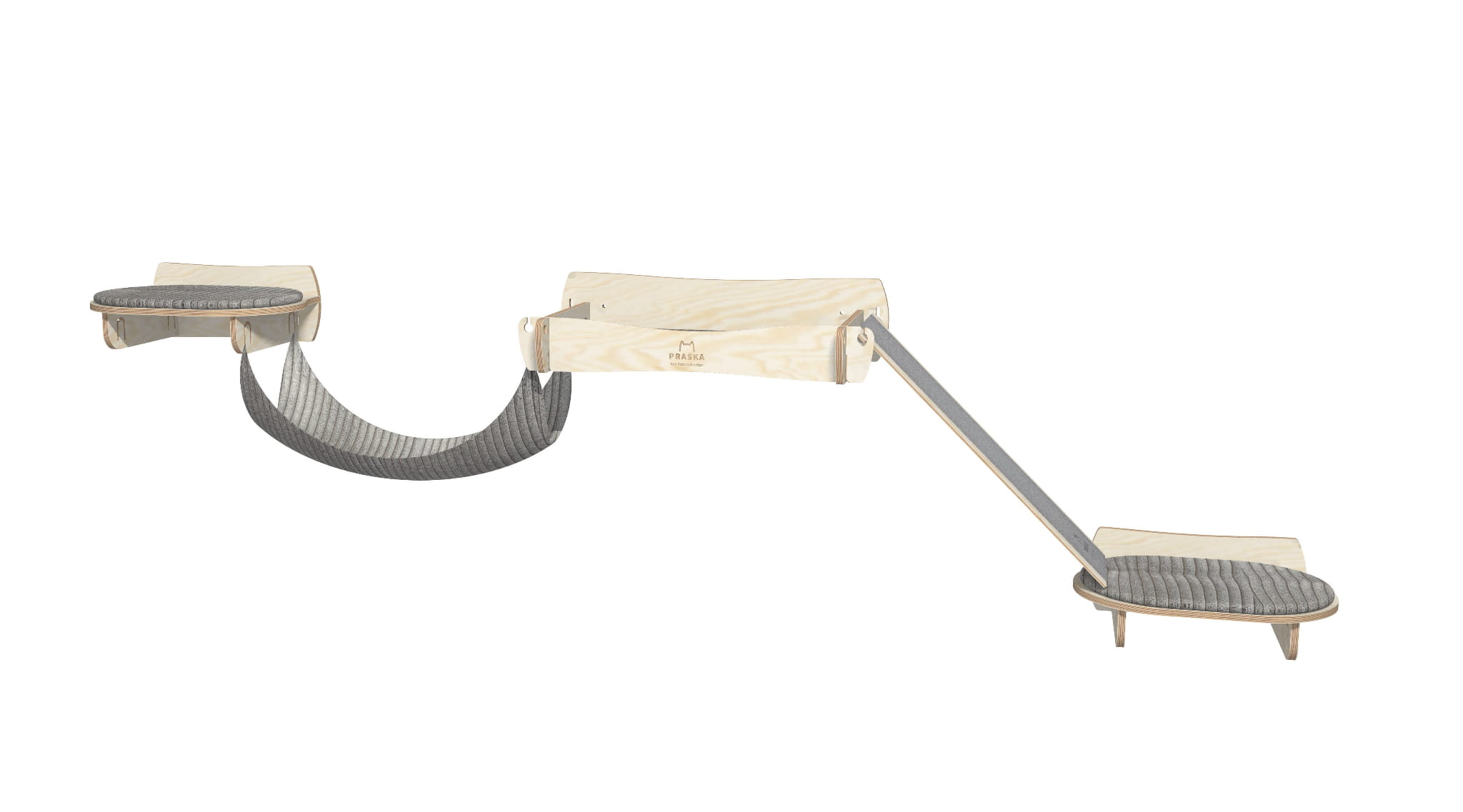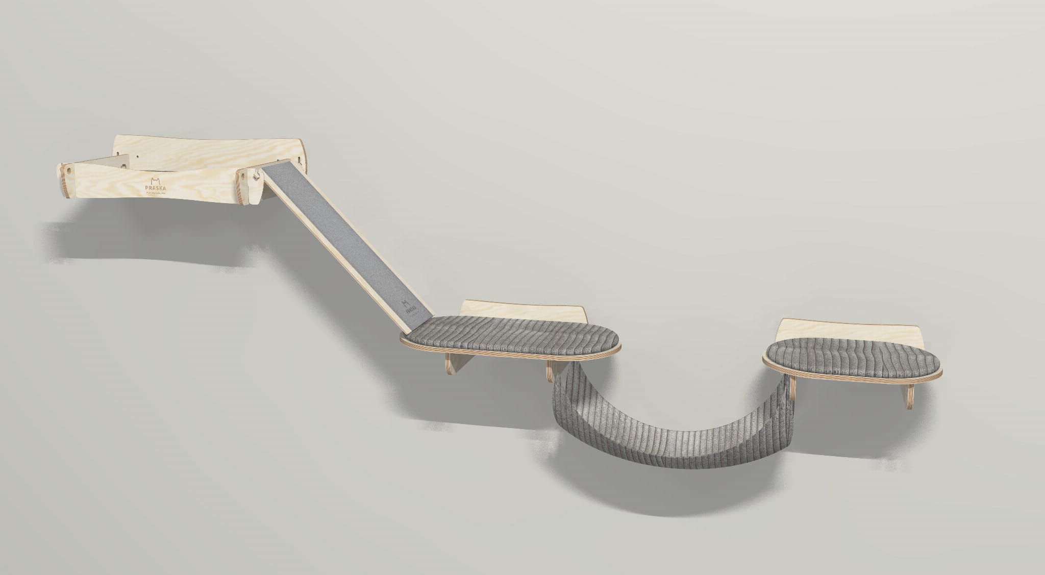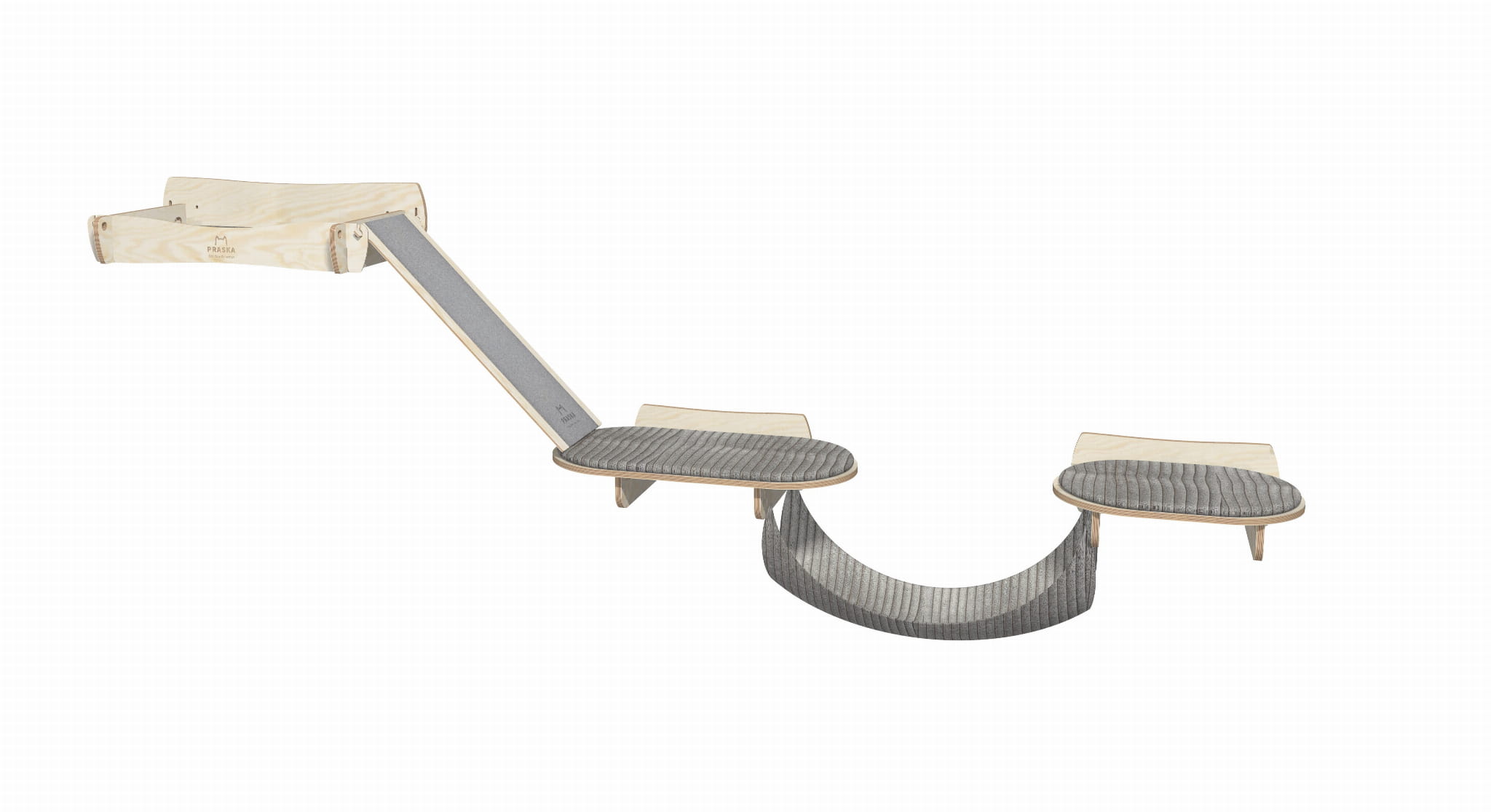 Modułowy design - Kładka idealnie wpasowuje się w systemy parków linowych PRASKA, co czyni ją istotnym elementem każdego kociego świata. Dzięki niej kot ma więcej przestrzeni do wspinaczki, zabawy i relaksu.