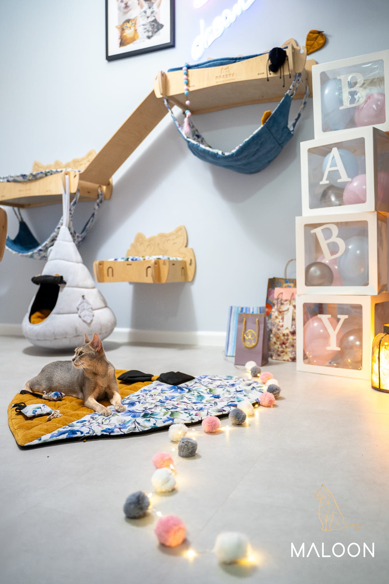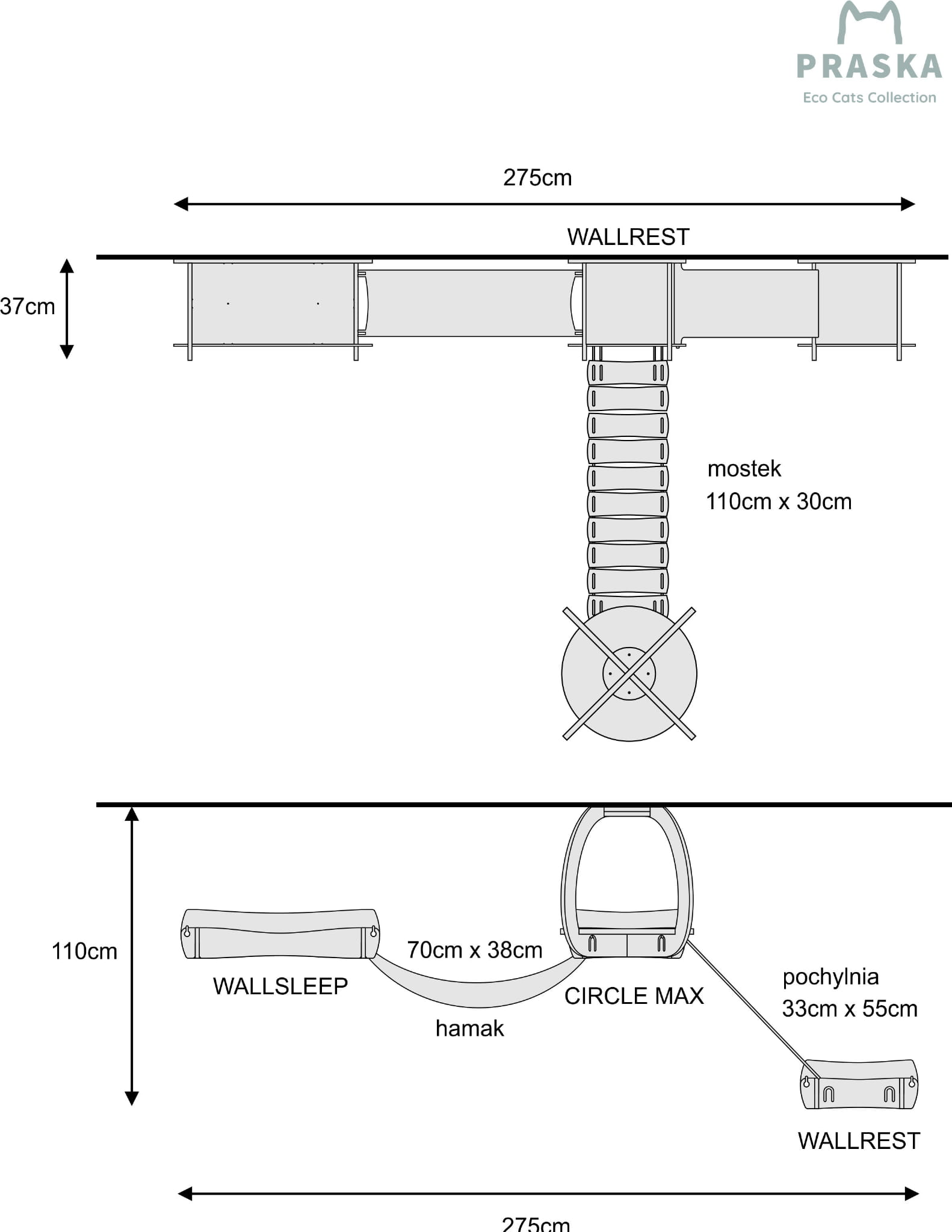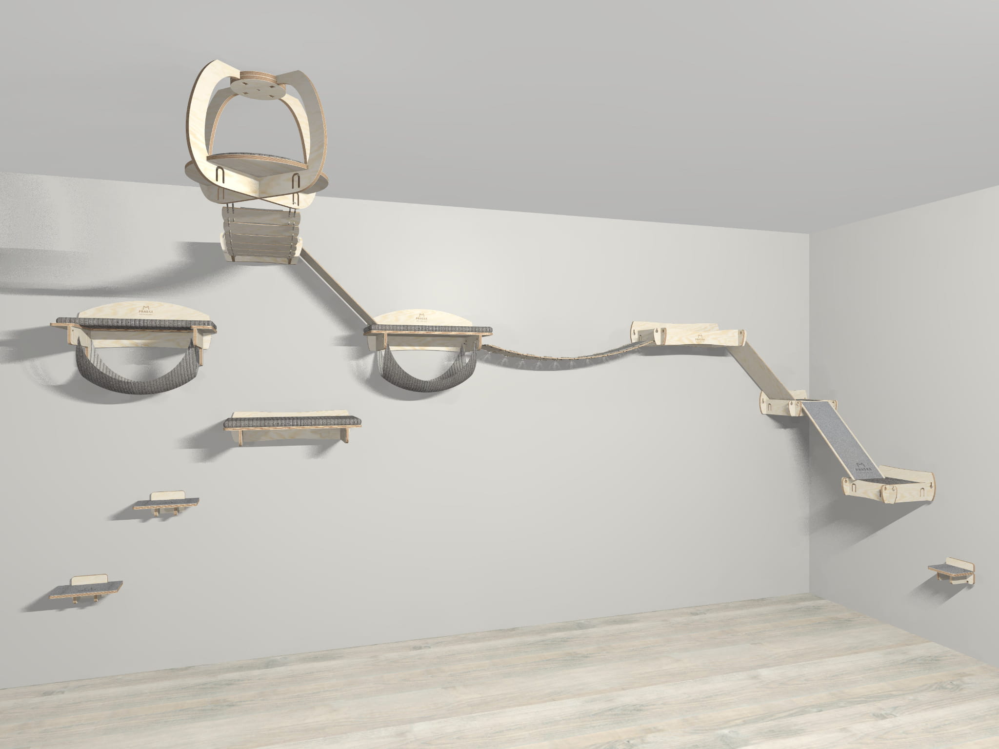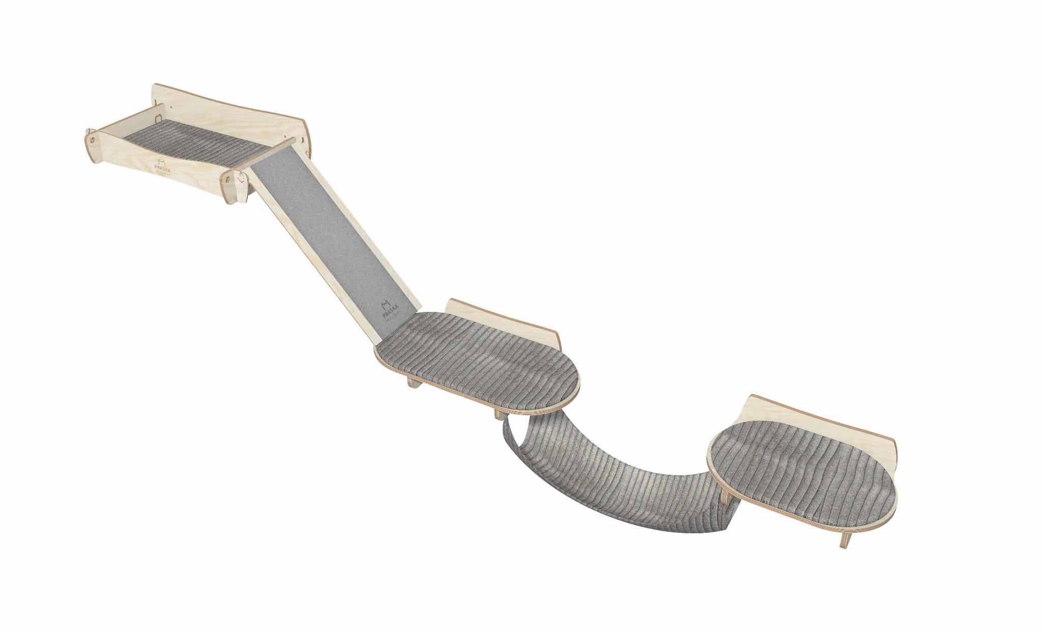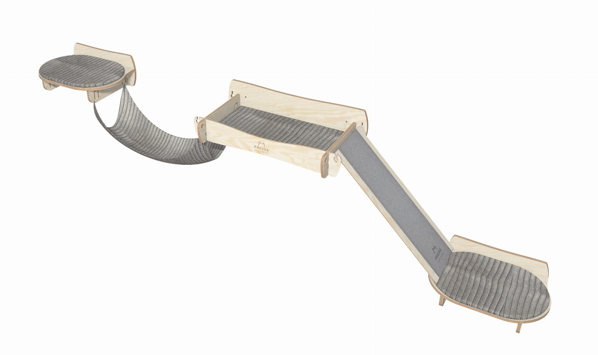 Modułowy design - Kładka idealnie wpasowuje się w systemy parków linowych PRASKA, co czyni ją istotnym elementem każdego kociego świata. Dzięki niej kot ma więcej przestrzeni do wspinaczki, zabawy i relaksu.