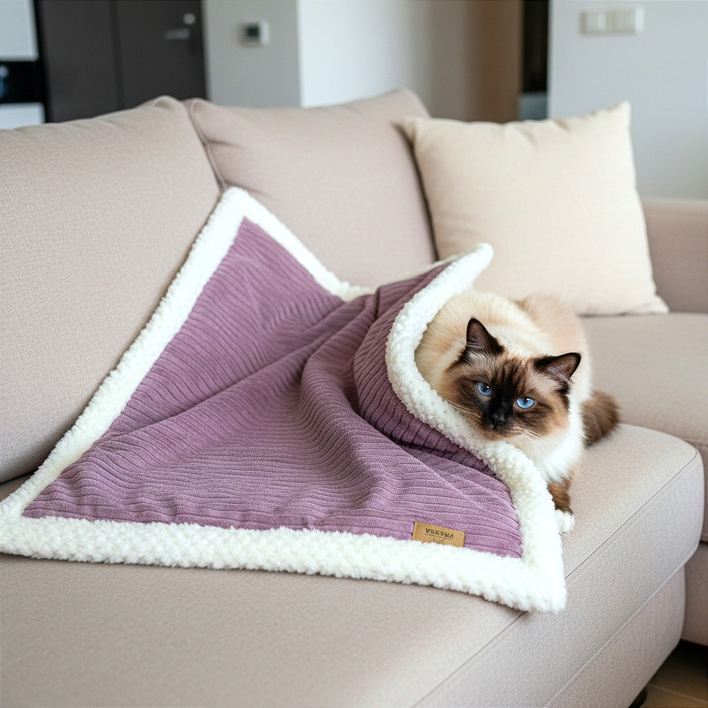To miękki, ciepły kocyk z eleganckiej tkaniny i puszystego futerka. Posiada w środku lekkie ocieplenie, dzięki czemu dobrze trzyma ciepło i zachowuje ładny kształt. Sprawdza się w domu, w podróży i jako część wyprawki, dla dziecka, kota lub małego psa.