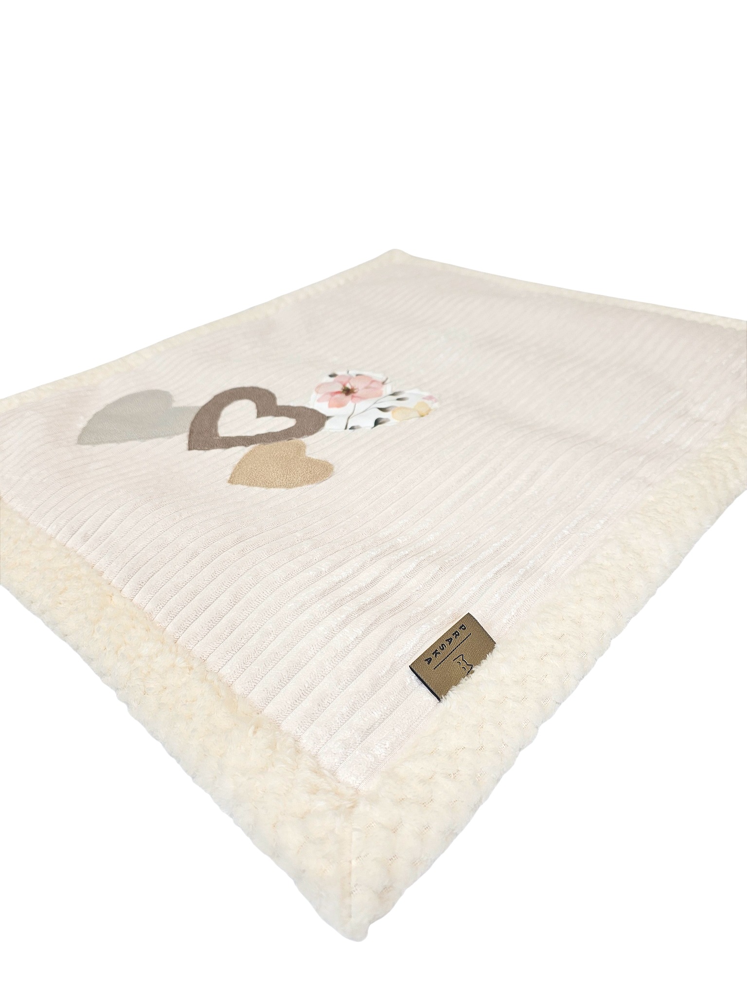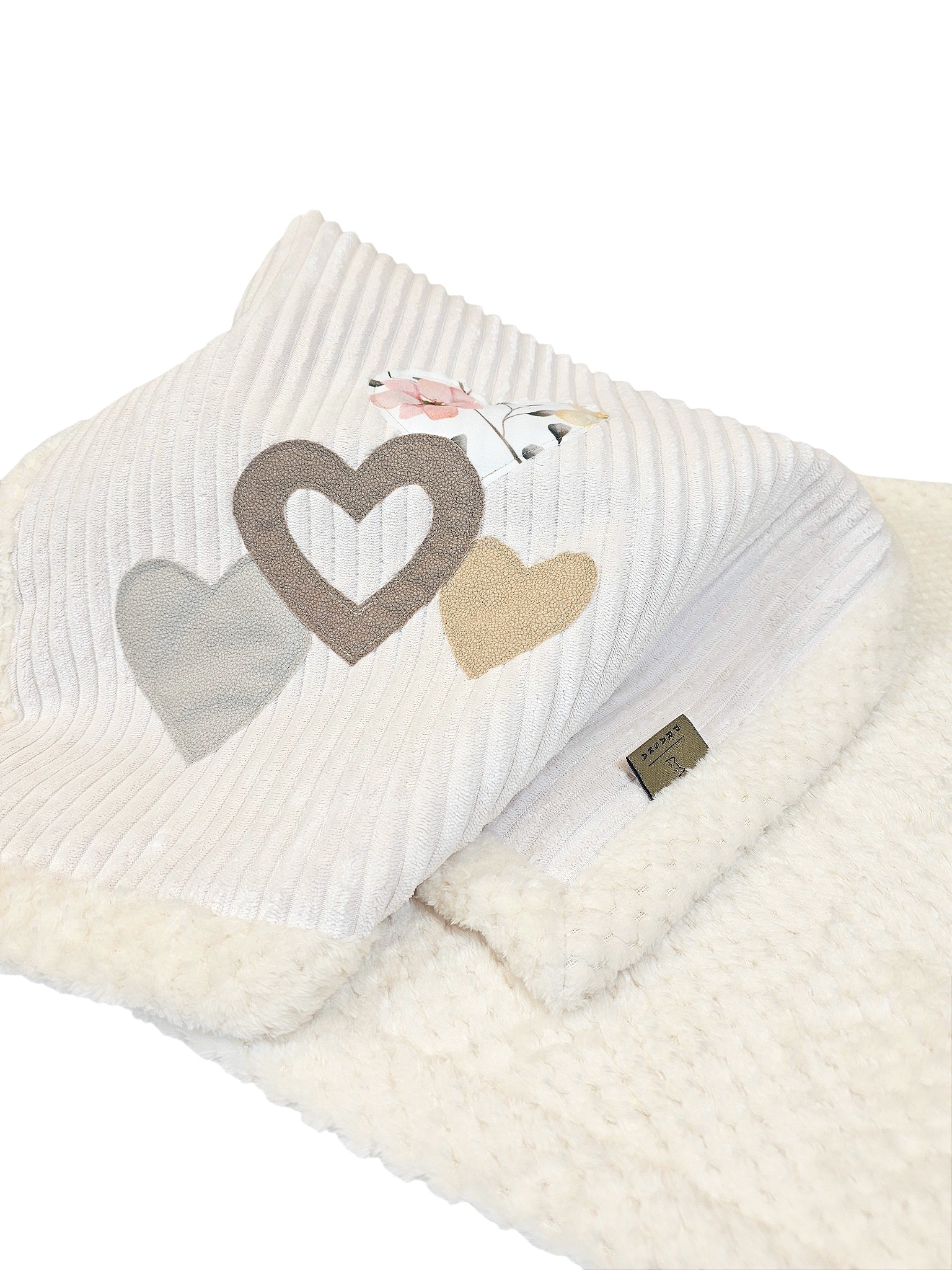 Ma ręcznie naszyte aplikacje w kształcie serduszek i małych, miękkich detali. Każdy element szyty jest osobno i solidnie zabezpieczony, więc nie odpruwa się i wygląda estetycznie przez cały czas użytkowania. To subtelny akcent, który dodaje kocykowi uroku, ale nie przesładza.