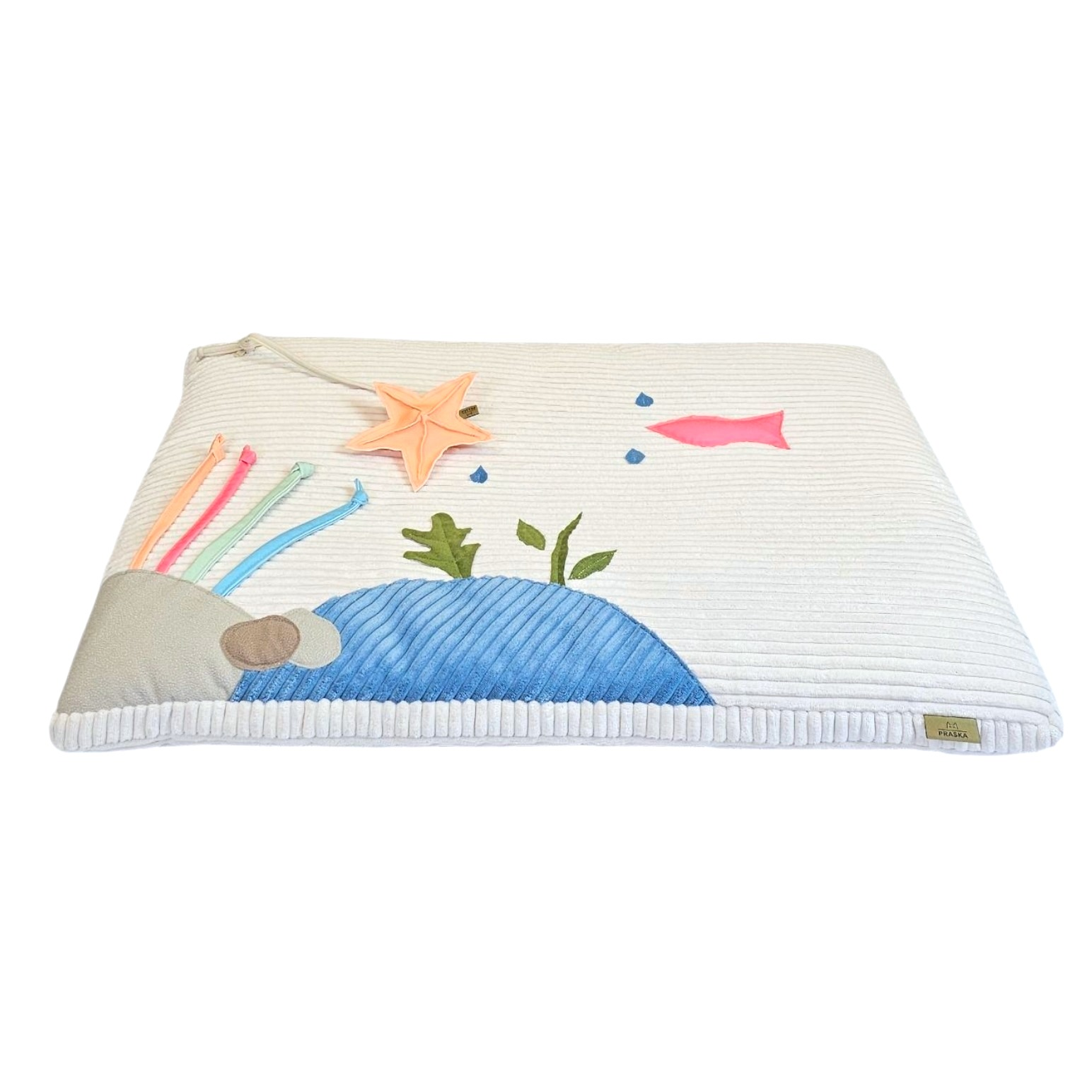 Ręcznie naszywane aplikacje w kształcie rybki, kamyczków, roślin i linii oceanu wprowadzają do wnętrza delikatny, naturalny akcent, zachęcając do dotykania i zabawy.