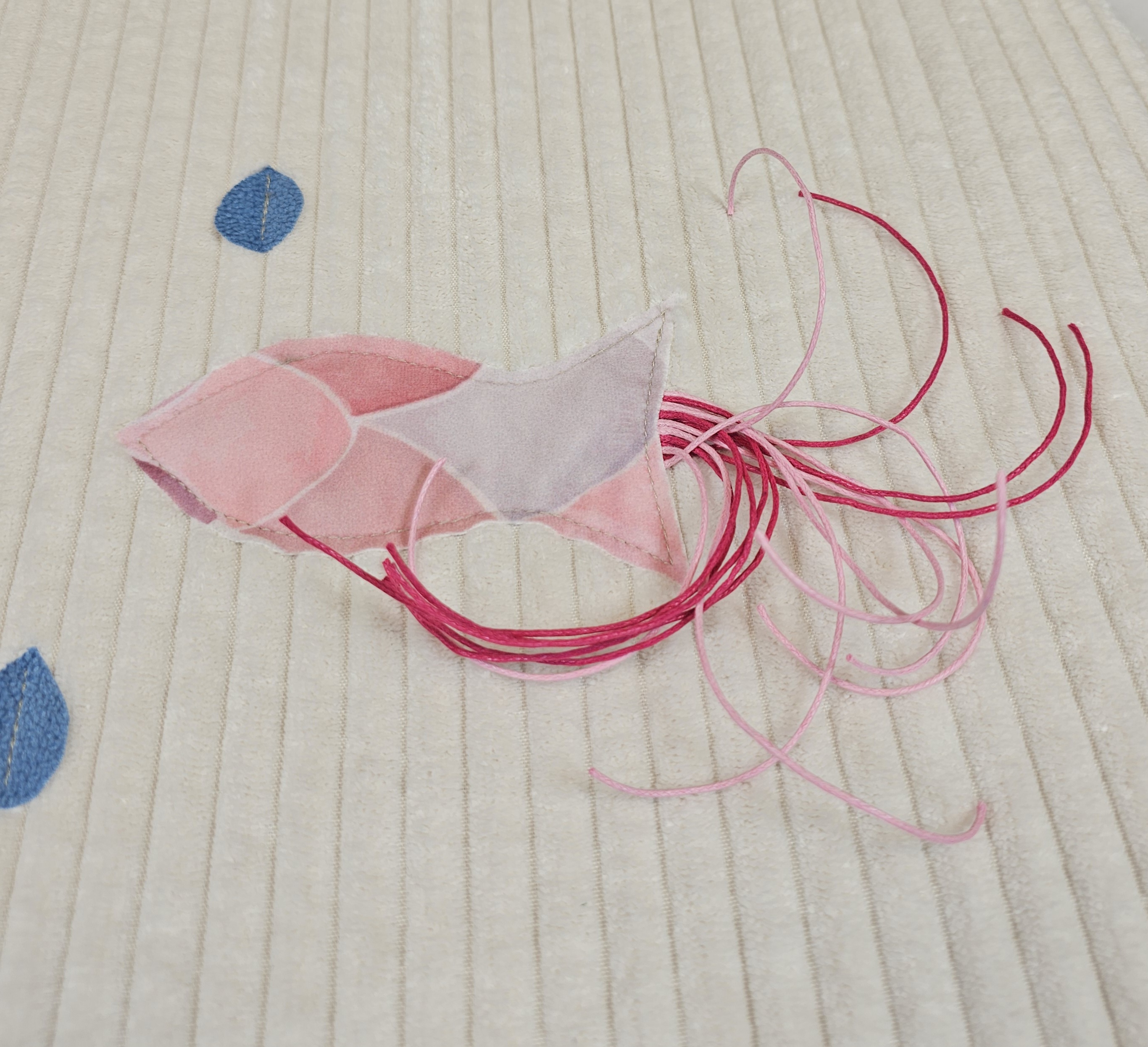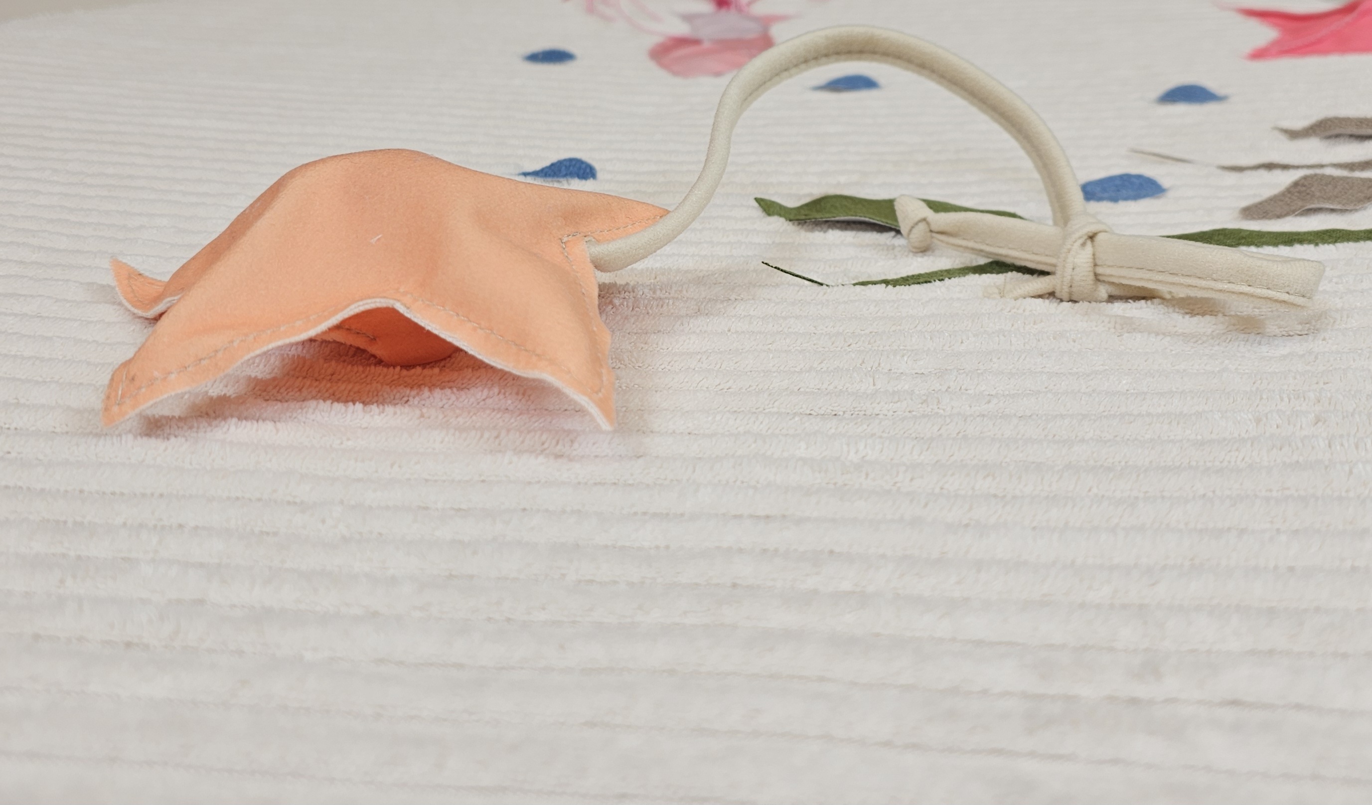 Na środku wszyta jest pętelka z zabawką w kształcie rozety.
