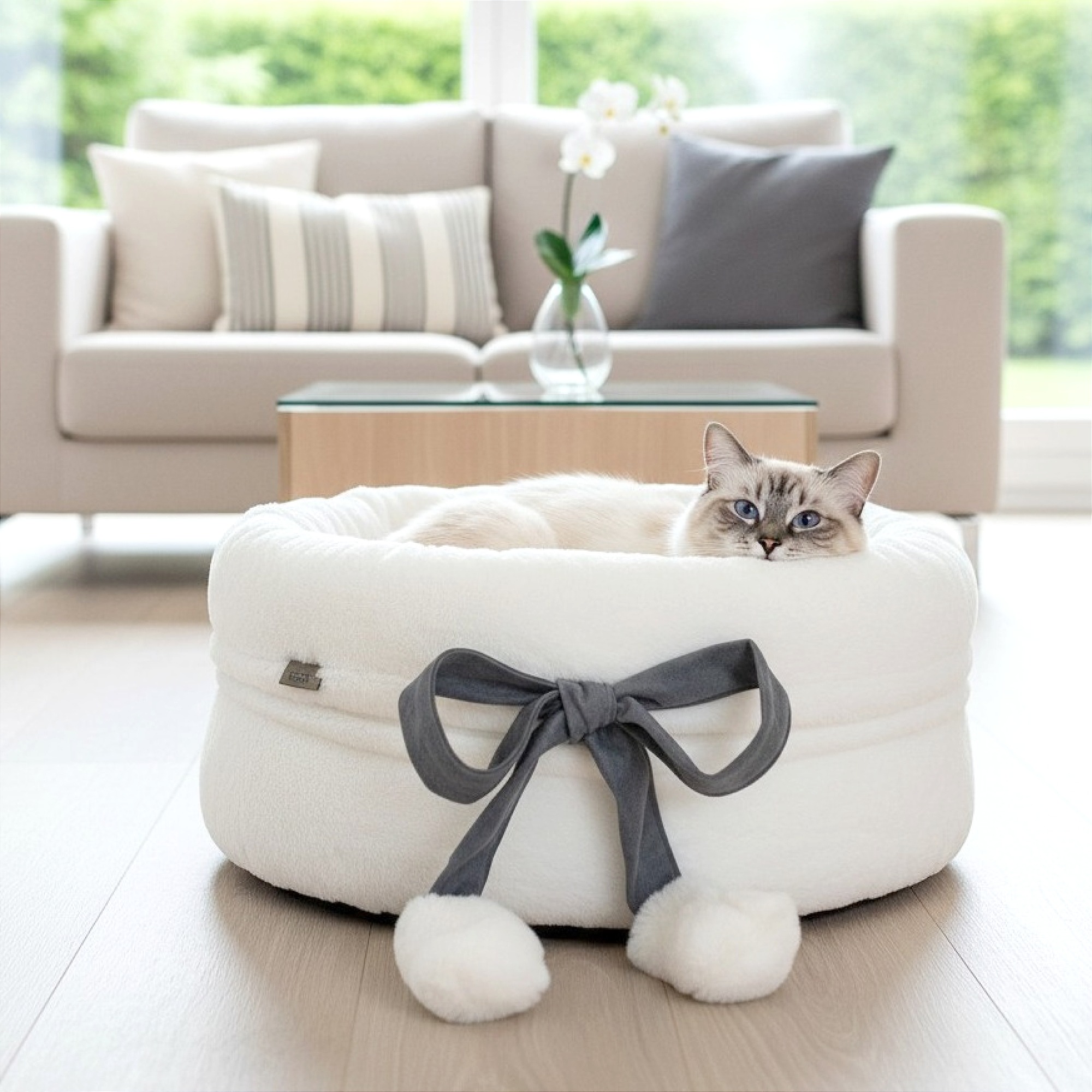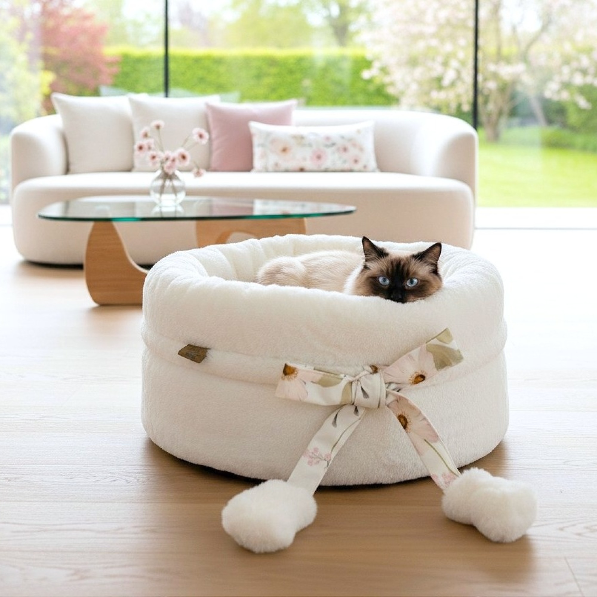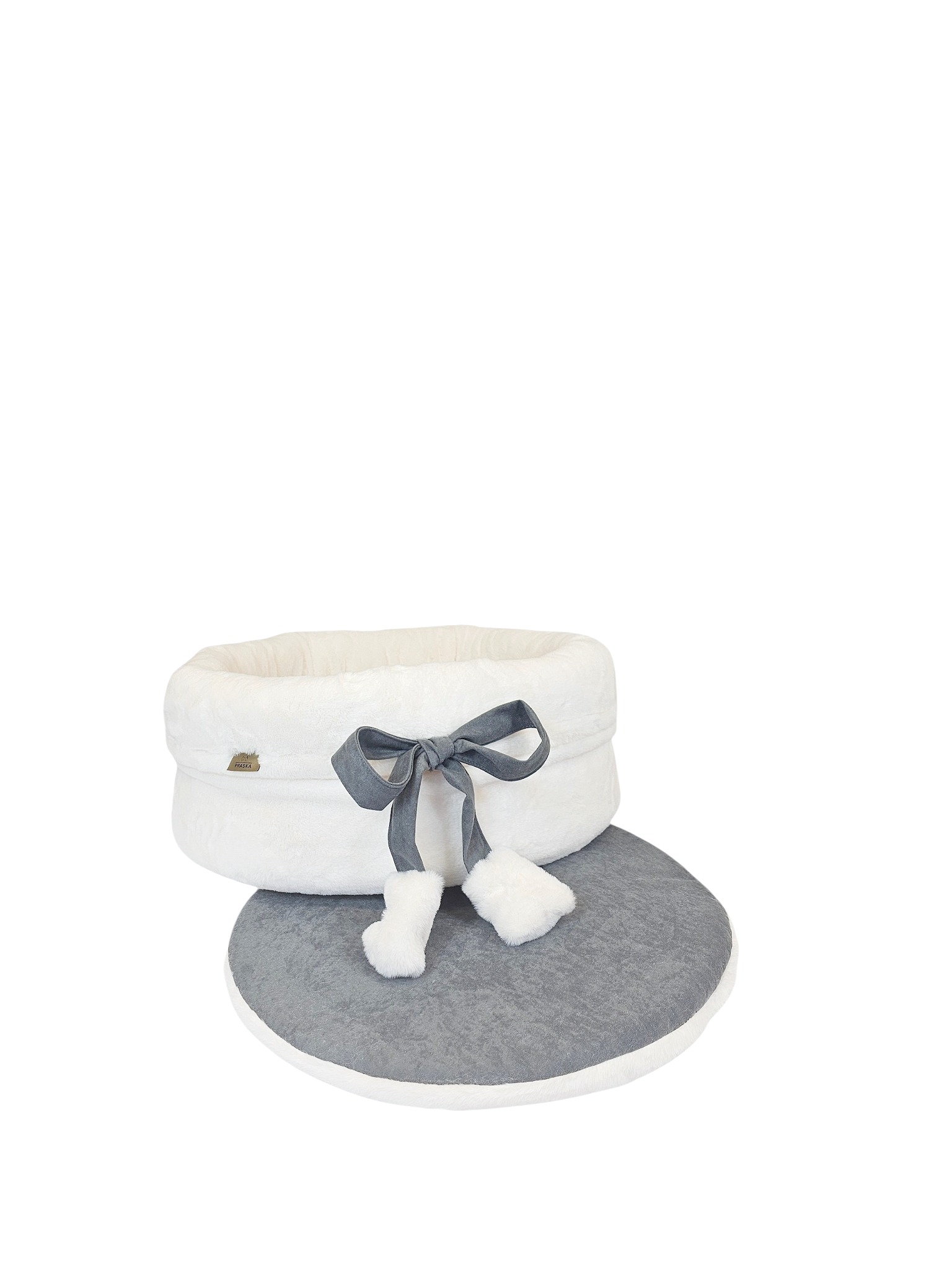 Wewnątrz znajduje się wyjmowana, dwustronna poduszka. Jedna strona wykonana jest z miękkiego futerka w kolorze mlecznym. Druga strona wykonana jest z tkaniny w kolorze wybranej kokardy. Poduszkę można prać oddzielnie, co ułatwia codzienną pielęgnację legowiska. Wypełnienie pozostaje sprężyste i nie zbija się nawet po wielu praniach.