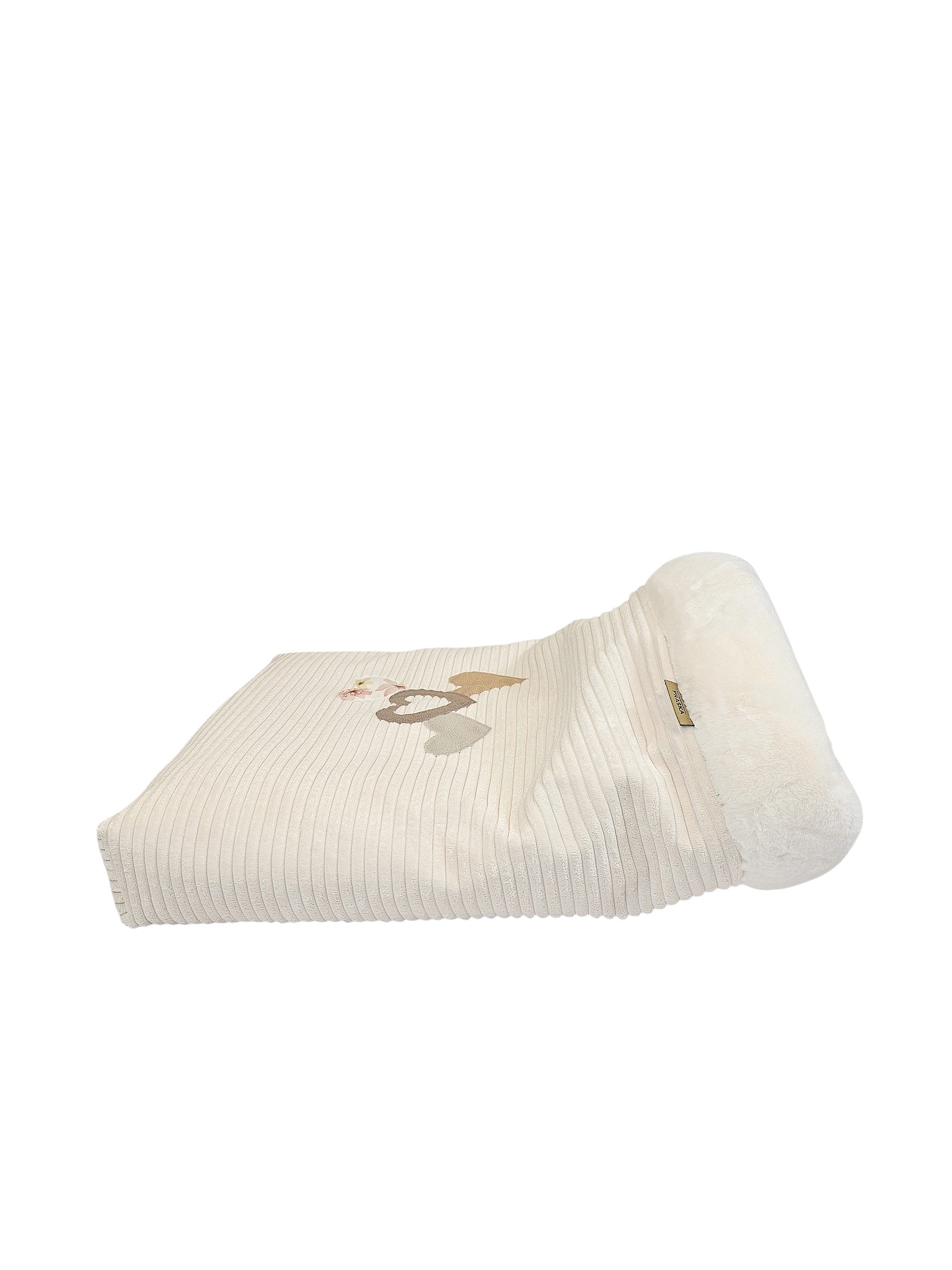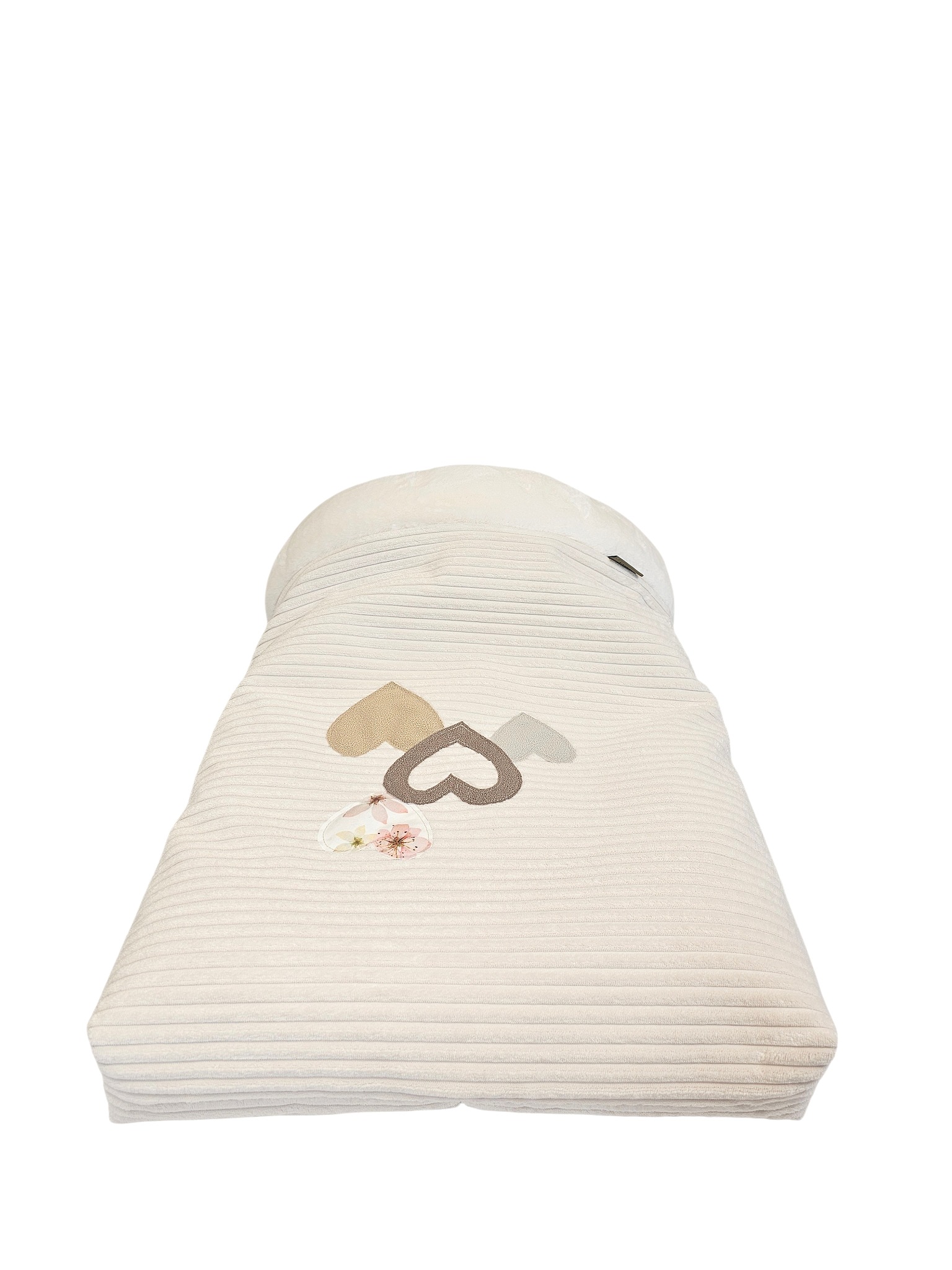Całe w kolorze mlecznym z ręcznie naszywanymi aplikacjami w formie serc. Z wyborem futra mlecznego lub czarnego.