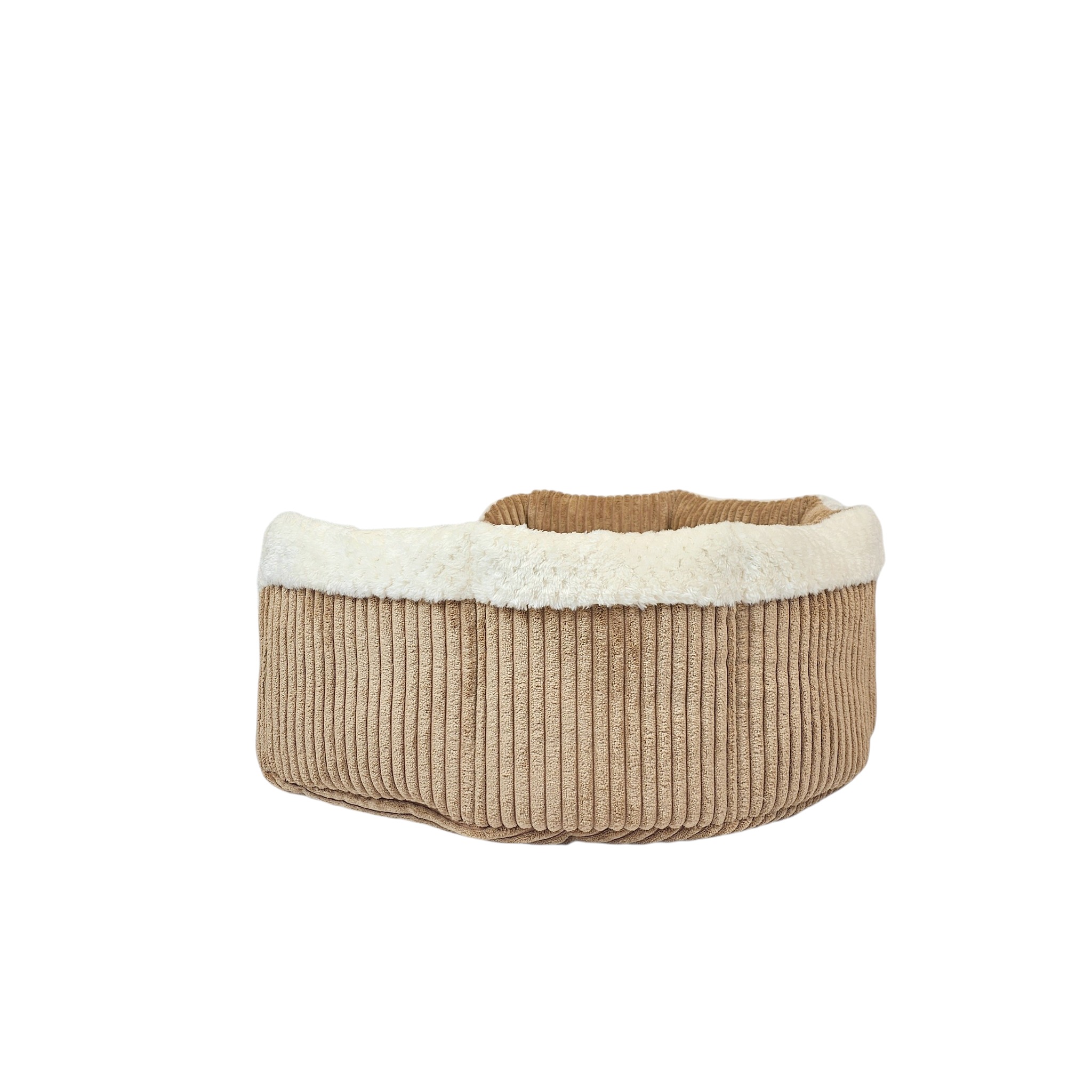 W środku znajduje się dwustronna poduszka. Z jednej strony wykończona jest tkaniną, z drugiej miękkim futerkiem.