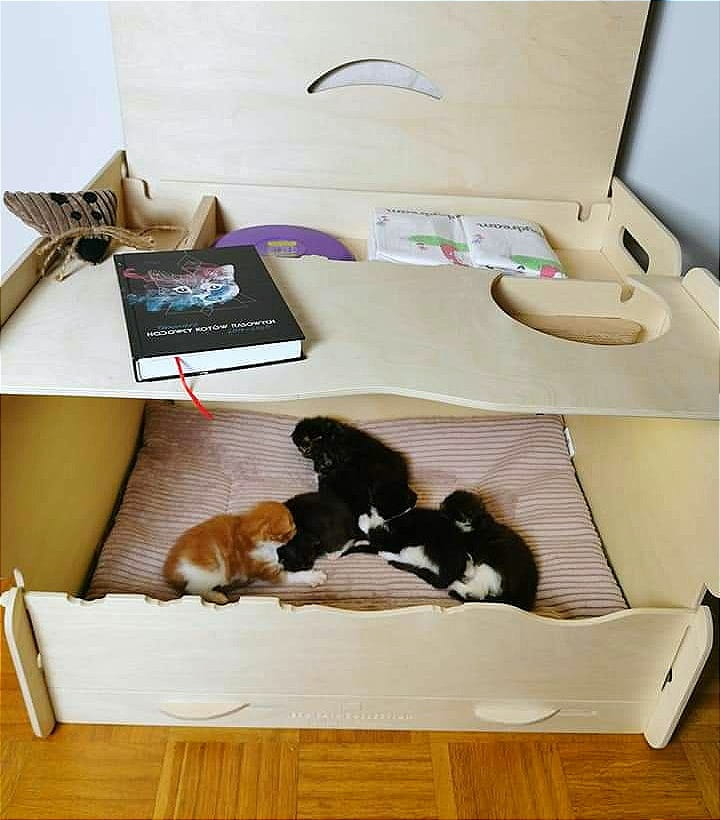 Po obróceniu można ją położyć na zamkniętej górnej klapie, co zapewnia łatwy dostęp do matki i jej kociąt podczas porodu oraz pielęgnacji miotu.
