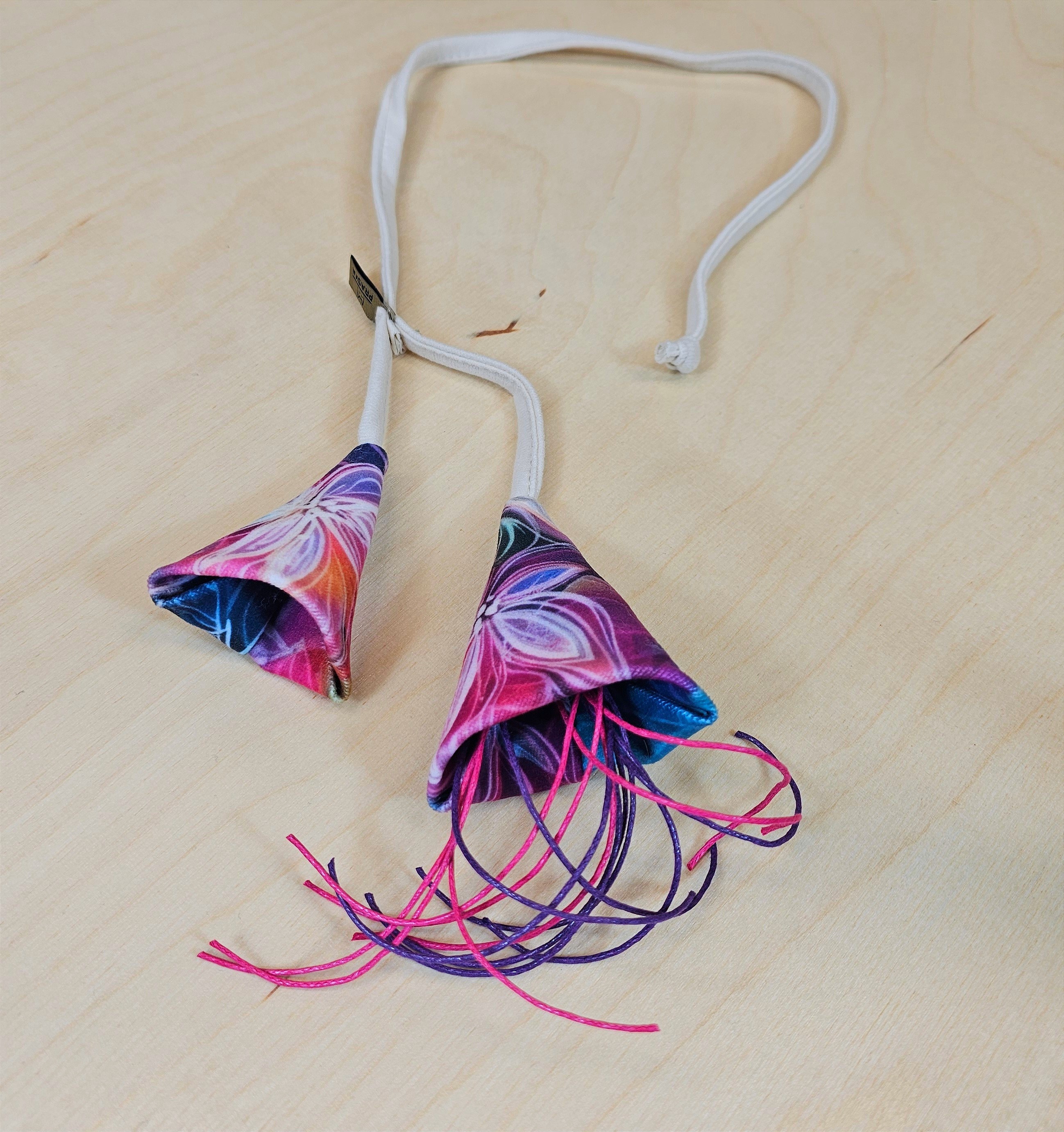 Z mocnymi kolorowymi sznureczkami - zachęca do skakania, łapania i tarmoszenia.