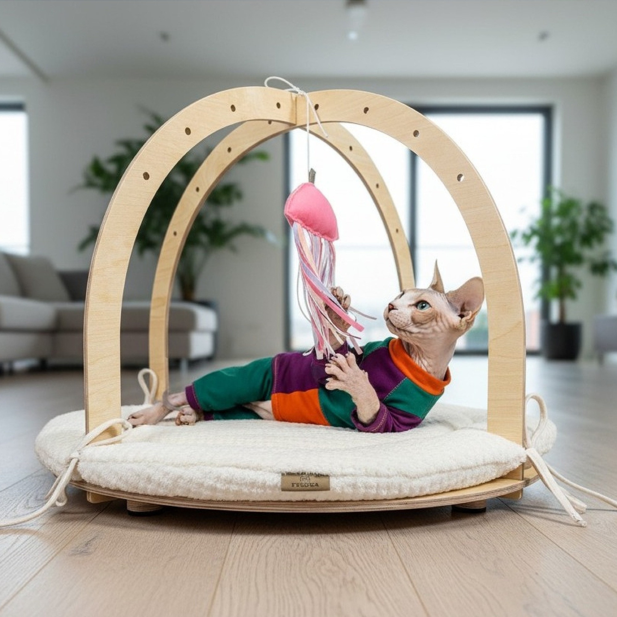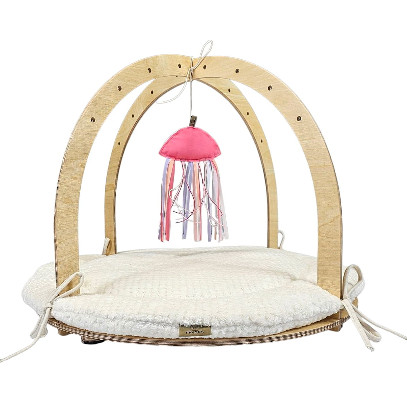 Plac zabaw dla kota, który łączy aktywność, stymulację i odpoczynek w jednym miejscu. Miękka mata oraz możliwość zawieszania zabawek tworzą środowisko dopasowane do naturalnych potrzeb kota.
