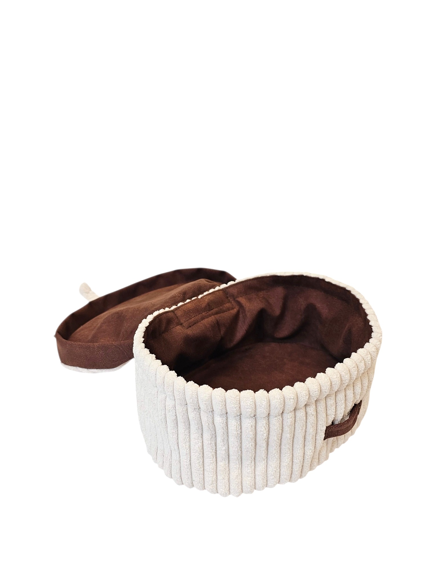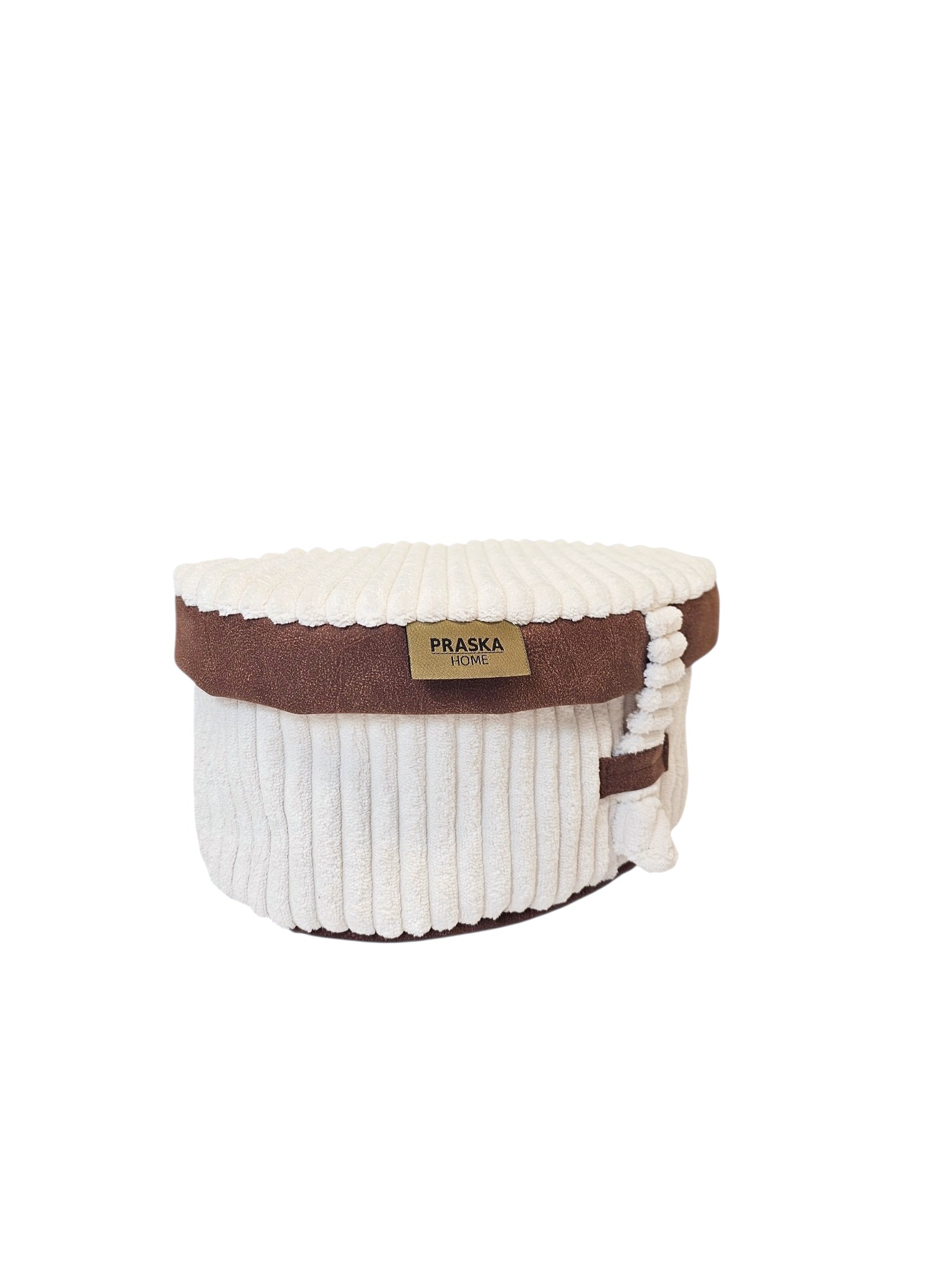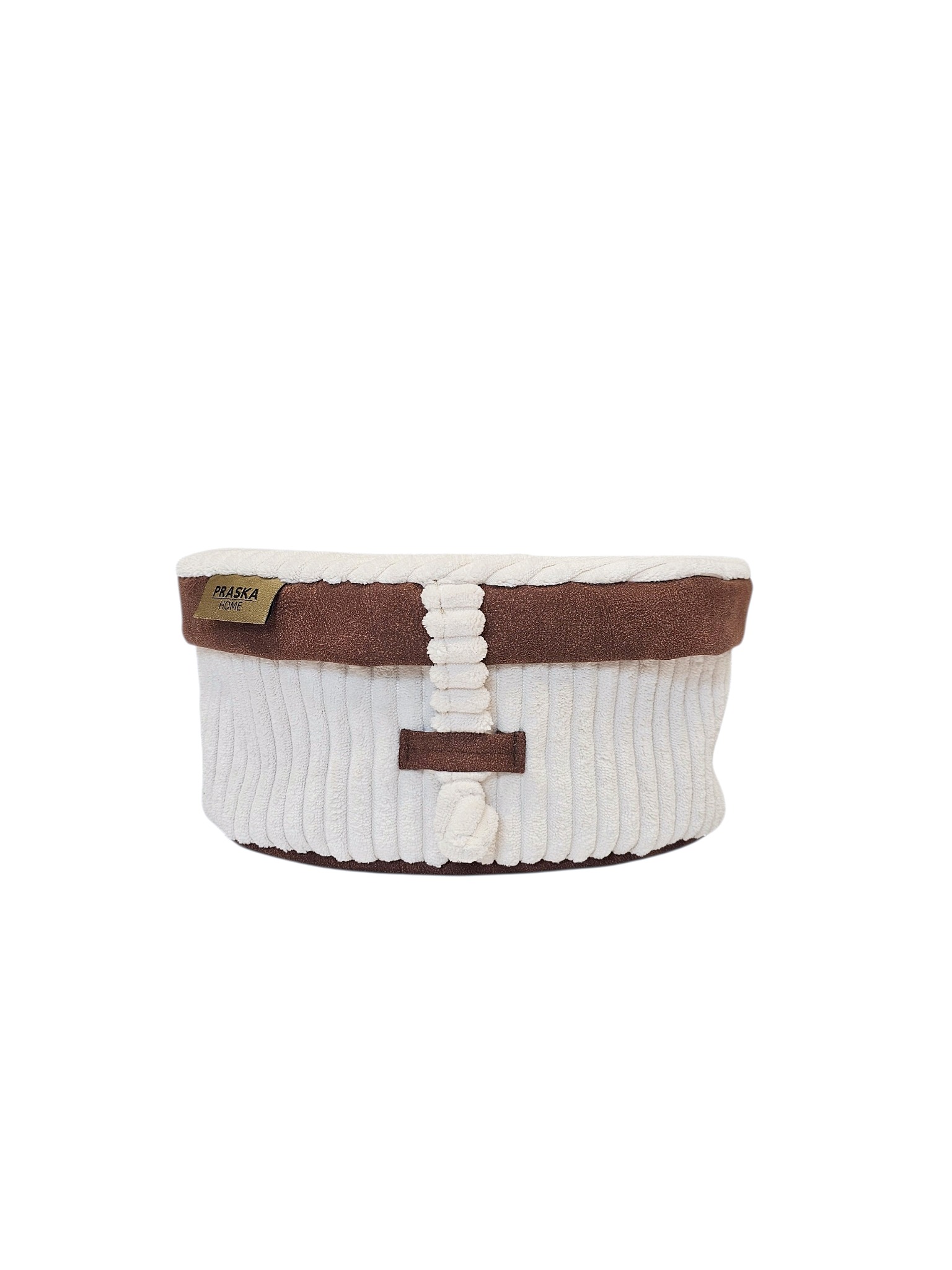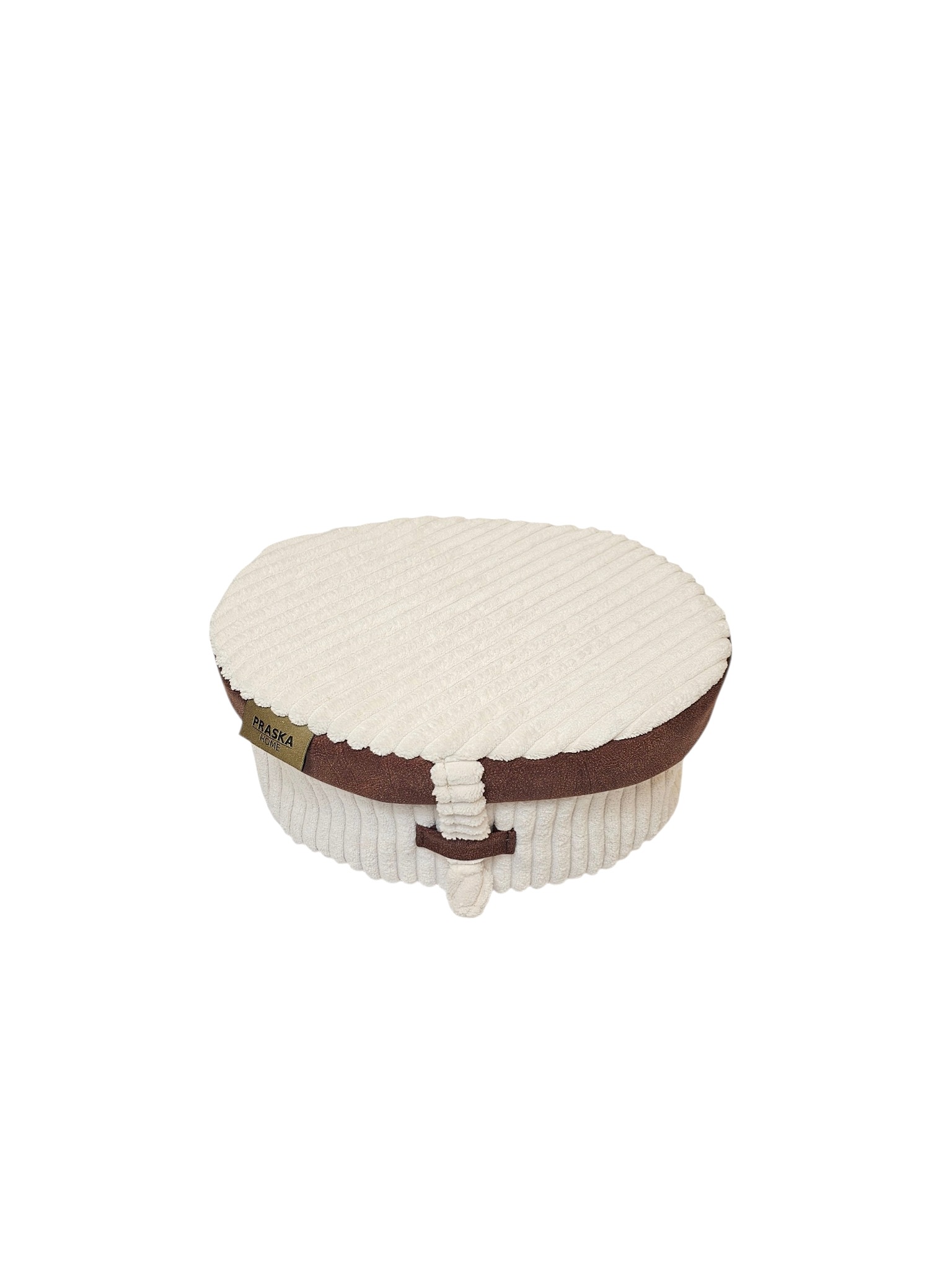 Uszyta z wysokiej jakości prążkowanej tkaniny w kolorze mlecznym, z wykończeniem z ekoskóry. Materiał jest trwały, dobrze znosi codzienne użytkowanie i zachowuje estetyczny wygląd.